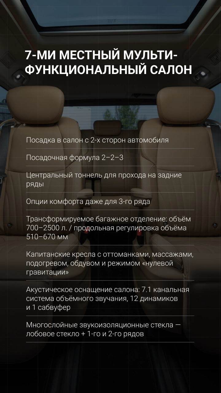 | Многослойные звукоизоляционные стекла (лобовое стекло + 1-го и 2-го ряда) | ✔ |